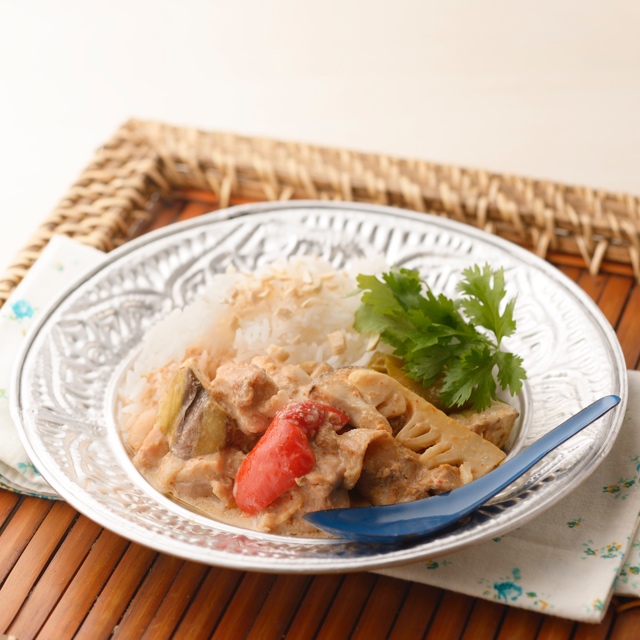 - 鶏モモ肉は一口大に切り、たけのこは薄切り、ふくろたけは2つに切る。ニンニク、生姜はみじんに切りにする。赤ピーマン、ナス、ピーマンは乱切りにする。