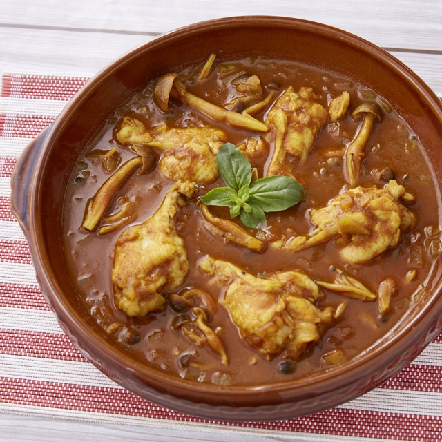 トマトベースのさらさらスープカレー。骨付きチキンをそのまま加えて加熱することで、うま辛だしを引き出します。