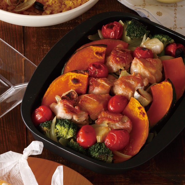 - ココットに玉ねぎ、ブロッコリー、かぼちゃ、ミニトマト、にんにくを並べ、好みでハーブソルトを振り、鶏肉を中央に並べる。